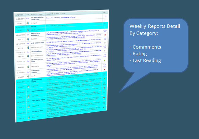 Look at the difference between the "actual" reported data and the "consensus" forecast. A significant difference can cause sharp market reactions. You can view a better picture of the year by organizing the year in 52-weeks.