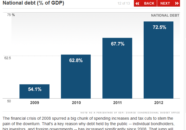 .Between Obama's inauguration day on January 20, 2009, through Oct 2, 2012, the TOTAL OF ALL DEBT ACCUMULATED THROUGHOUT THE ENTIRE HISTORY OF OUR NATION, was INCREASED BY OVER 65%, adding over 5.5 trillion dollars to our nation's crushing debt burden!